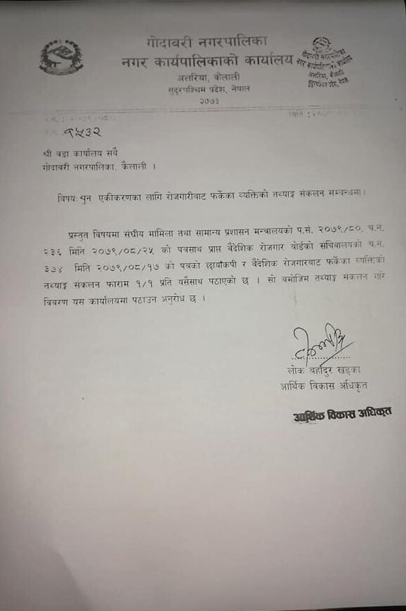 श्रम रोजगार तथा सामाजिक सुरक्षा मन्त्रालय अन्तर्गतको वैदेशिक रोजगार बोर्डको सचिवालयले स्थानीय तहको सहकार्यमा पुनः एकीकरणका कार्यक्रमका लागि पत्राचार गरे बमोजिम गोदावरी नगरपालिकाले प्रत्येक वडामार्फत तथ्याङ्क संकलन गर्ने जनाएको छ ।