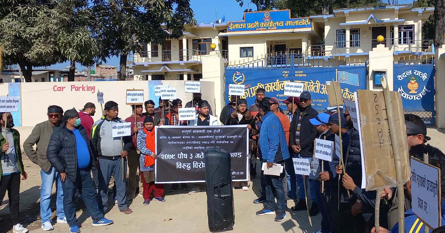 आज (शुक्रबार) अत्तरिया उद्योग वाणिज्य संघको अगुवाईमा व्यापारीहरुले टाउको र हातमा कालो पट्टि बाधेर गोलिकाण्डको विरोध गरेका छन्। सुनचाँदी व्यवसाय विकास सुनारमाथि गोली प्रहारका दोषीलाई अहिलेसम्म पनि पक्राउ नगरेको भन्दै व्यवसायीहरुले प्रदर्शन गरेका छन्।