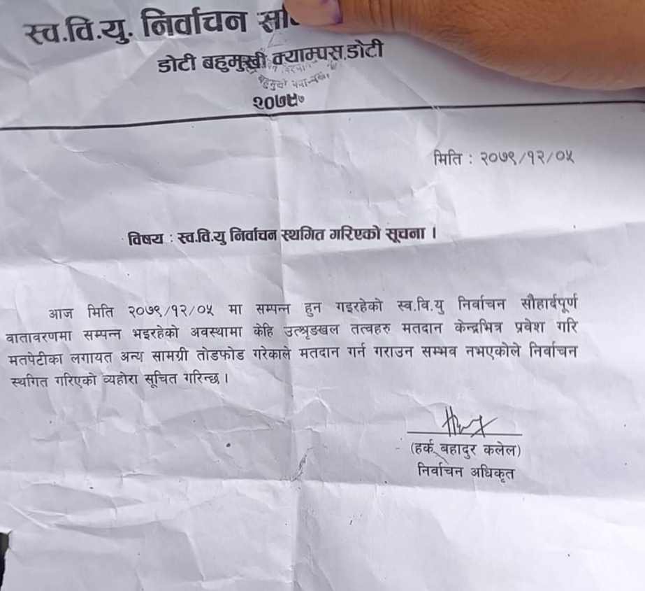 ‘केही उत्सृंखल तत्त्वहरू मतदान तत्त्वहरू मतदान स्थलभित्र प्रवेश गरेर मतपेटिका लगायत अन्य सामाग्री तोडफोड गरेको हुँदा मतदान गर्न गराउन सम्भव नभएकाले निर्वाचन स्थगित गरिएको ब्यहोरा सूचित गरिन्छ ’निर्वाचन अधिकृत कँडेलले जारी गरेको सूचना भनिएको छ ।